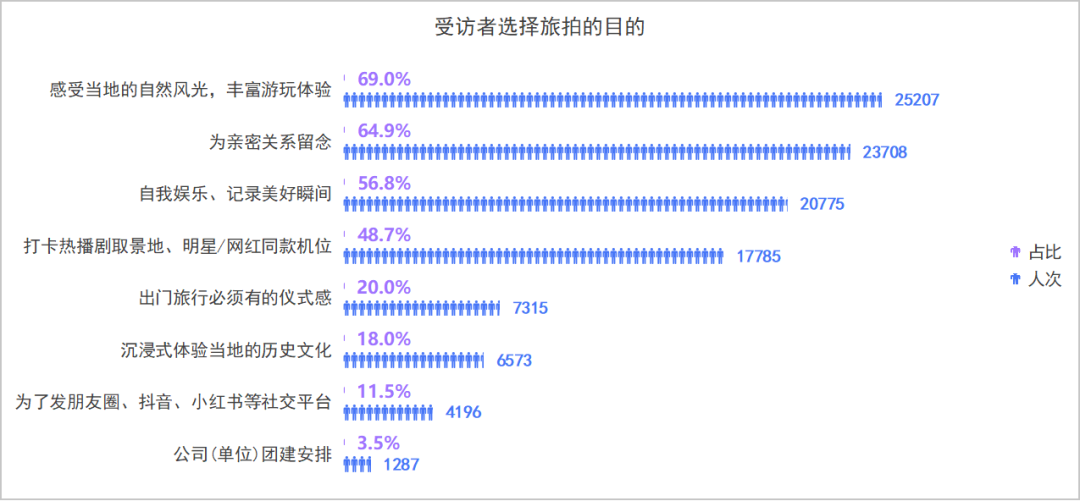 “感受当地的自然风光,丰富游玩体验”“为亲密关系留念”“自我娱乐、记录美好瞬间”以及“打卡热播剧取景地、明星/网红同款机位”是消费者选择旅拍的主要目的。