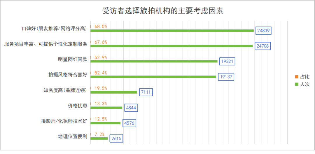 关于选择旅拍机构的主要考虑因素,口碑和服务项目的丰富性与个性化是消费者最为关注的方面,明星/网红同款以及拍摄风格也是影响消费者选择机构的重要因素。