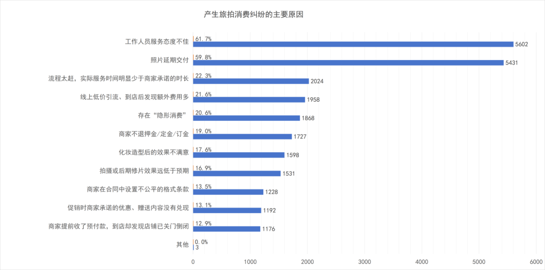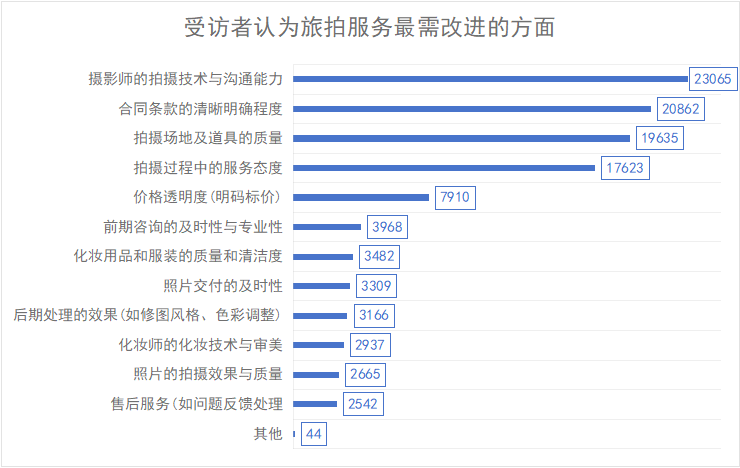关于旅拍服务需要改进的方面,消费者反映最集中的是摄影师的拍摄技术与沟通能力、合同条款的清晰明确程度、拍摄场地及道具的质量以及拍摄过程中的服务态度。