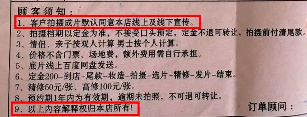 合同是消费者履约维权的重要依据,但体验发现,旅拍行业与消费者签订书面合同较少。在前期咨询的188家店铺中,仅有17家表示可出具合同或协议,占比仅9%。实际体验过程中,发现部分商家提供的合同约定不够清晰,与消费者存在重大利害关系的内容未显著提示以及存在不公平不合理的格式条款。例如,上海黄浦某摄影工作室提供的合同存在“延误交货不超过10天不负赔偿责任”等减轻或者免除经营者责任的条款;安徽部分旅拍馆提供的合同存在“客户拍摄成片默认同意本店线上及线下宣传”“以上内容解释权归本店所有”“任何口头承诺视为无效,一切以本书面合同为准”等不合理条款。