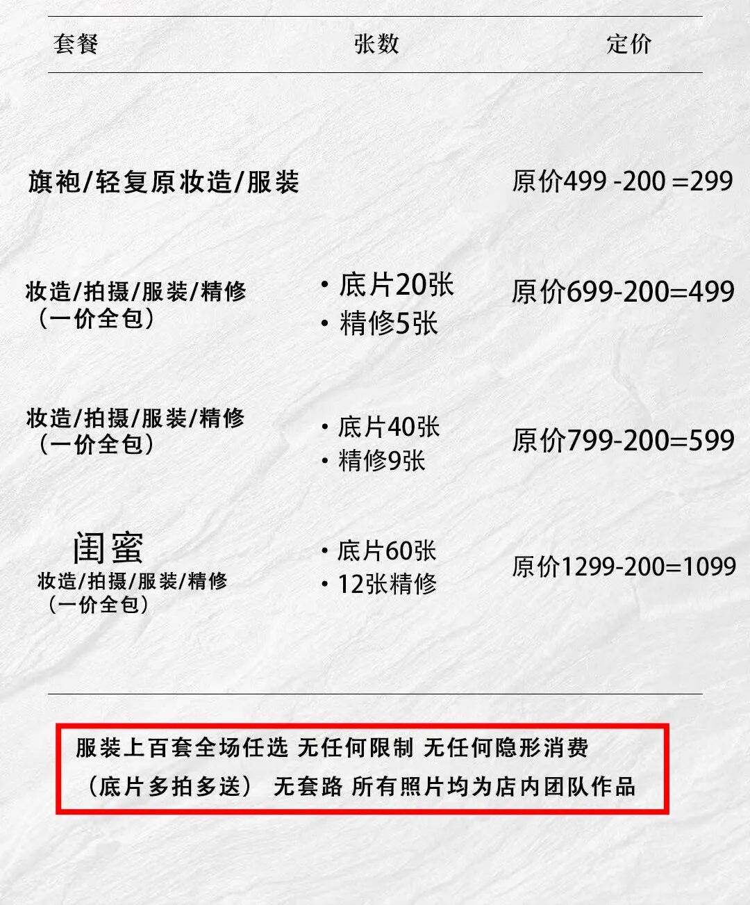3.预订支付需“明确”。提前与商家确认所有收费细节,如服装是否全场免费任选、化妆品和配饰(如假睫毛等)是否额外收费、外景门票及交通费由谁承担等,避免“隐性消费”。支付定金前,务必明确退款条件。