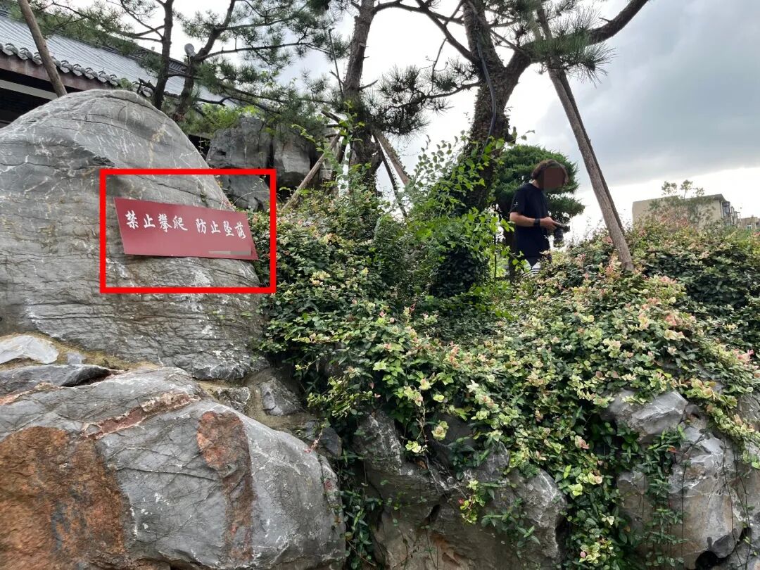 体验还发现,部分摄影师在拍摄时无视相关安全警示标识,或者引导消费者穿过湿滑的石头道路、在夜间以悬空姿态倚坐在河边石阶边缘进行拍摄等,存在一定安全隐患。例如,江苏扬州某汉服体验馆摄影师在拍摄时不顾景区内明令禁止攀爬的警示标语,带着相机爬上假山进行拍摄。