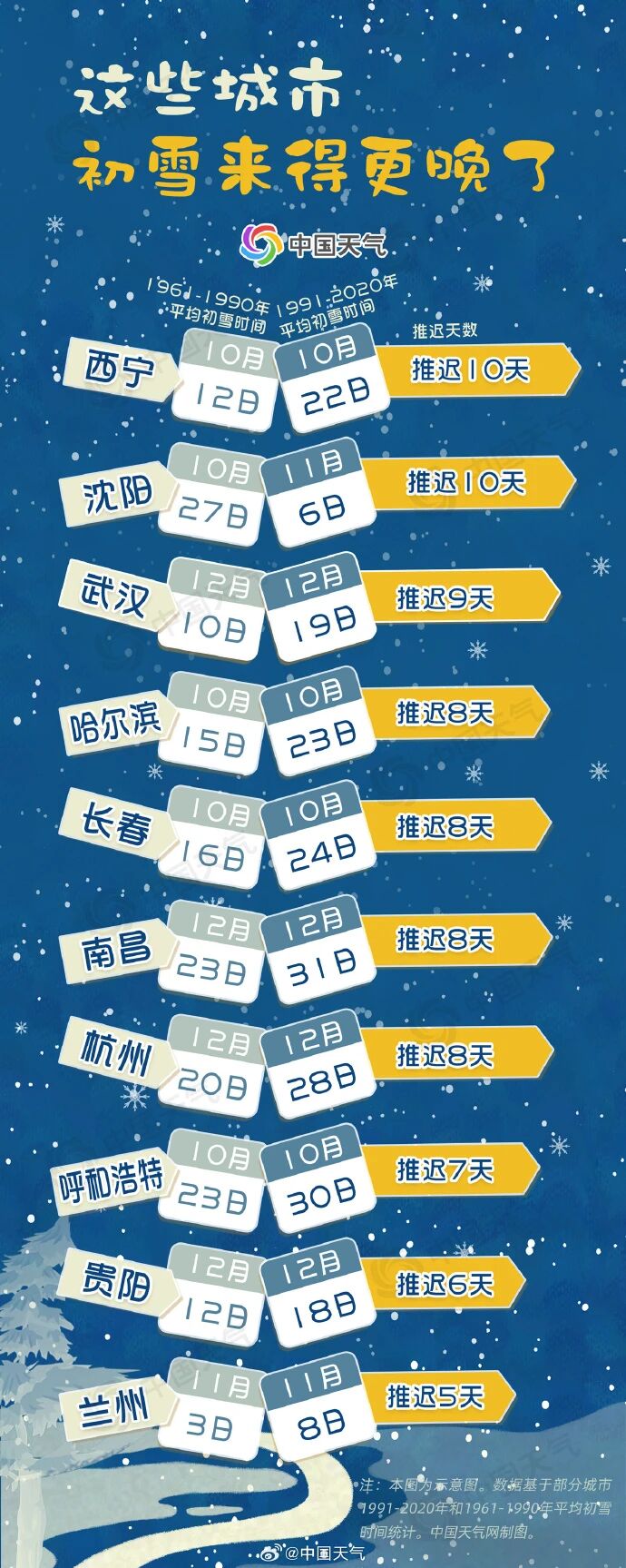 这波初雪推迟并非个例,盘点1961年至今的气象大数据发现,华北、黄淮等地初雪不仅来得不早,还呈现出越来越晚、雪日越来越少的趋势。而南京今年入冬偏晚,主要是因为副热带高压位置异常偏北、强度偏强,阻挡了北方冷空气南下,导致冷空气无法顺利推进至南京地区。虽然11月中旬曾有紫金山头陀岭飘雪的零星消息,但主城并未出现明显降雪,距离红墙覆雪、踏雪寻梅的景象还需等待。