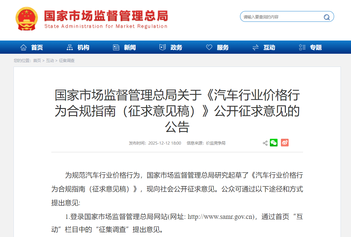 市场监管总局12日发布《汽车行业价格行为合规指南(征求意见稿)》,向社会公开征求意见。