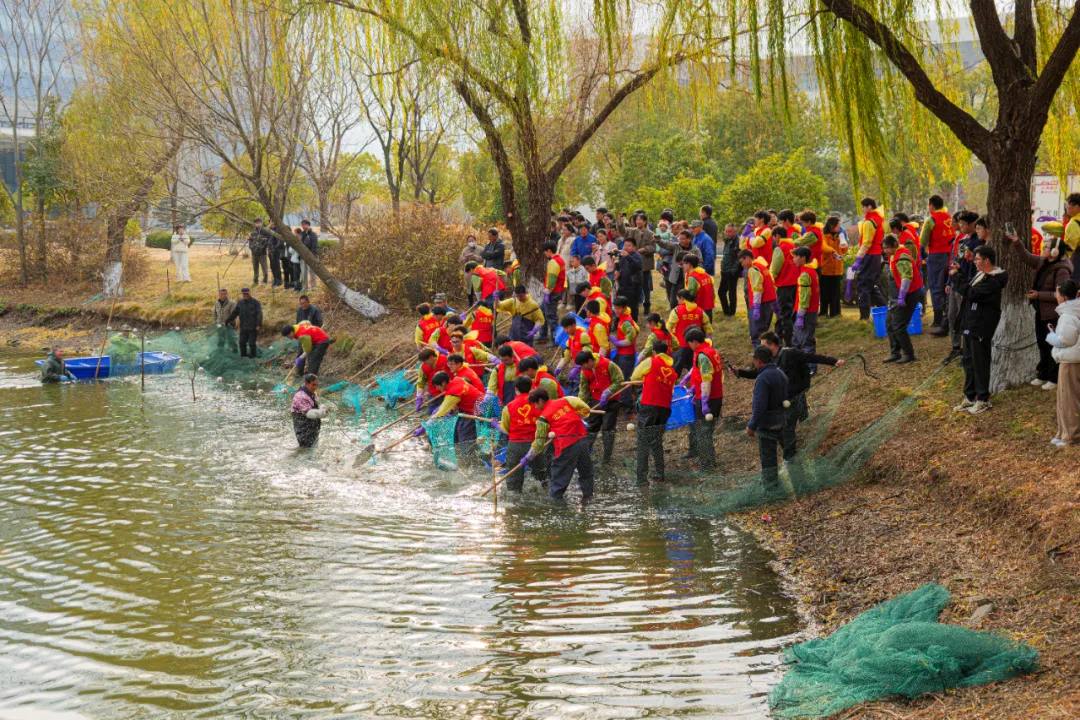 交汇点讯 “开捕喽!”锣声穿透冬日晴空,扬州大学扬子津校区朗月湖畔瞬间炸开欢腾的热潮。50名身着连体防水衣的师生纵身跃入湖中,渔网划破粼粼波光,时而弓身围堵,时而探手擒拿,滑溜溜的鲜鱼在掌心扑腾,溅起的水花打湿了眉眼,却挡不住脸上的滚烫笑意。