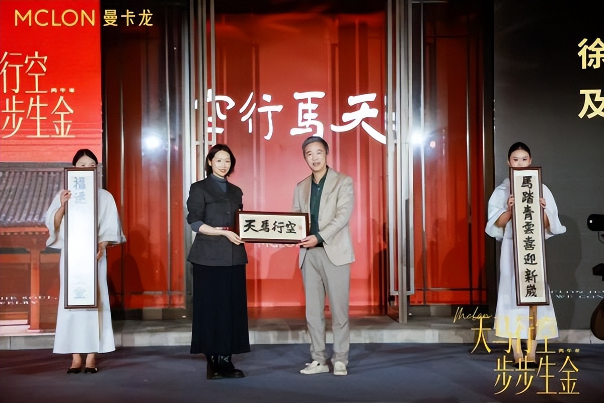 徐悲鸿美术馆馆长杨净将徐悲鸿之子徐庆平亲手题写的“天马行空-马年春联” 手书赠送给曼卡龙品牌,笔墨传递昂扬精神,也见证三方的深厚情谊。