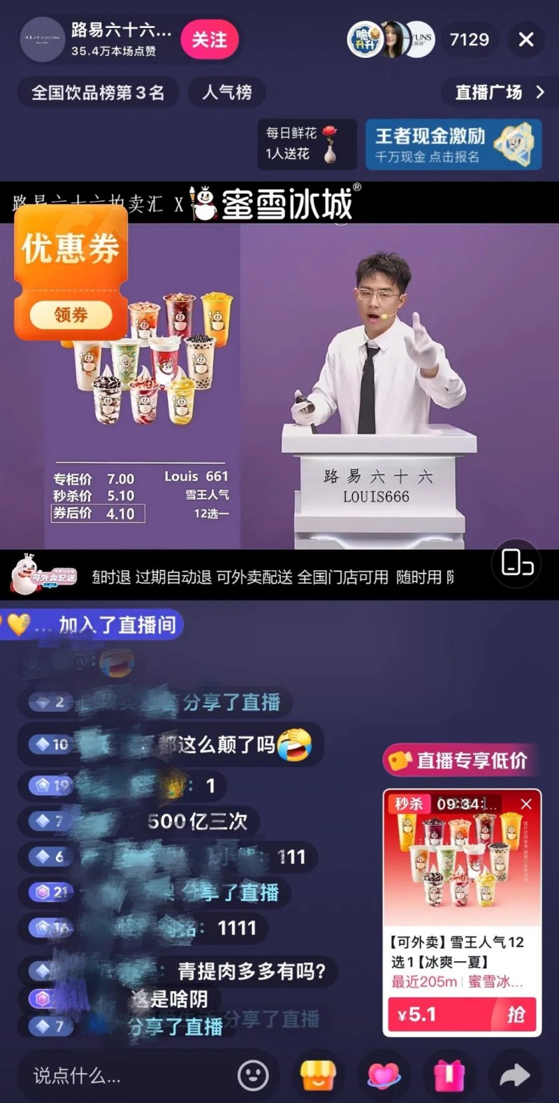 在「路易六十六拍卖汇」的直播间,定制的佳士得拍卖台上被争抢的竟是大家熟悉的蜜雪冰城。当高端小众场景进入生活消费领域,网友的热情被迅速点燃,直播间大量弹幕与主持人就「免除东方明珠攻击、当沪签主理人」等热梗进行互动。这种伪拍卖不仅调动了大家的消费热情,更让蜜雪冰城的资深消费人群与品牌建立了进一步的好感,「这样的活动雪王可以多来点」。游戏化的带货形式,让观众既薅到了羊毛,也为品牌增加了大量UGC二创内容。