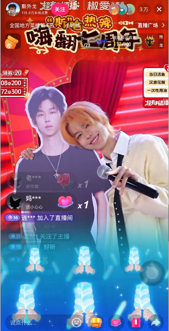11月29日,斯外戈在抖音联合椒爱水煮鱼开播,在演绎《银色夜空》《慢慢》歌曲的同时搭配即兴freestyle舞蹈串烧,直播甚至包含了大量talk互动环节,完全接近舞台实况的效果。斯外戈全程与自己的等身立牌同框,不少网友被这份「水仙文学」的抽象乐子吸引,留下来一起参与热火朝天的抢券活动。