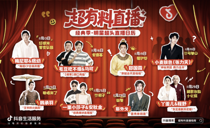 这些都是抖音生活服务首个内容IP「超有料直播」中的内容,首季「经典季」以「致敬、重现、创作经典」为主线,每场邀请明星主播担任「经典主理人」,通过主题互动呈现高可看性的直播内容。
