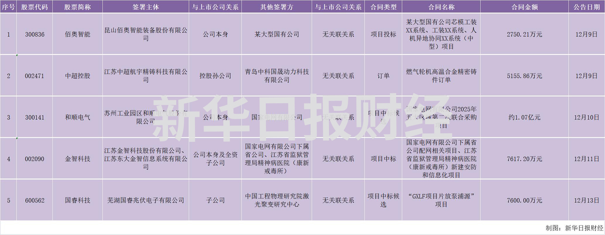 12月9日,昆山佰奥智能装备股份有限公司发布公告,公司参与的某大型国有公司芯模工装XX系统、工装XX系统、人机异地协同XX系统(中型)投标,投标报价为2750.21万元。2025年10月23日,相关平台发布了中标候选人公示,公示期为2025年12月10日至2025年12月12日。该项目中标后的实施,预计对公司未来经营业绩产生积极影响,其合同的履行不影响公司经营的独立性。