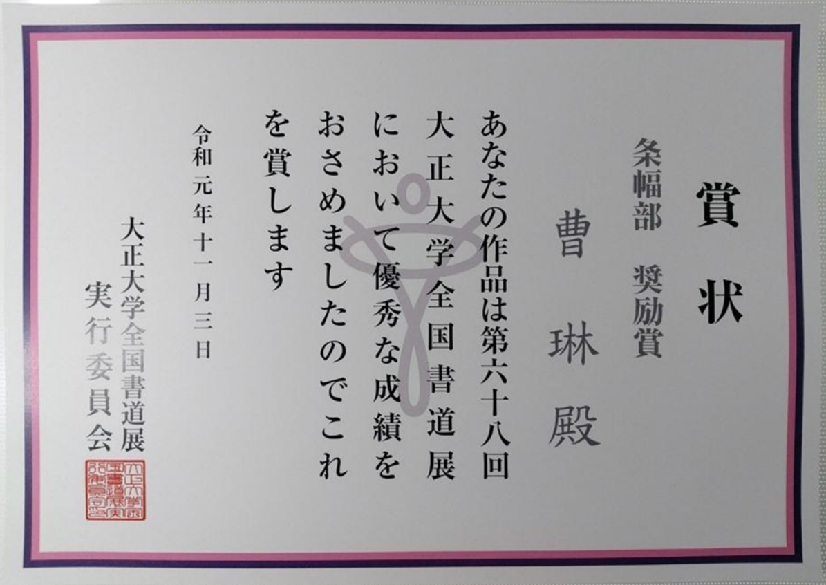 日前,日本大正大学主办的书法作品展落下帷幕,其中由曹琳女士选送的作品在众多书艺作品中脱颖而出,经过严格的初评、复评、终评以及内容审读,被组委会一致评为本届优秀作品,并入选展出。凭借对艺术表现力和创造力的深入理解,曹琳将传承传古典之雅的艺术坚守与创新表现得淋漓尽致,令人印象深刻的艺术实践一时被业界广为议论和赞叹!