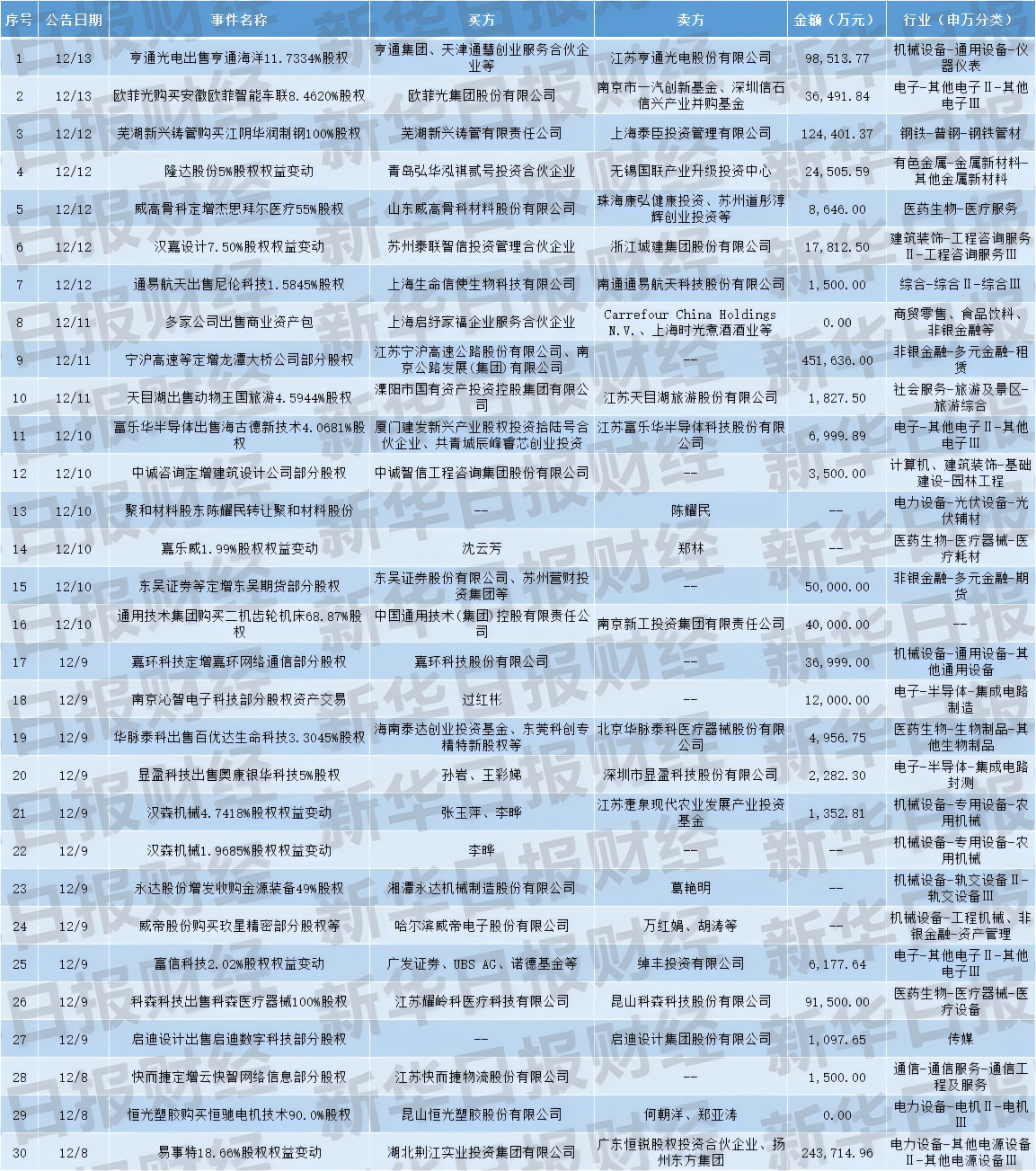 新华日报财经讯 本周并购亮点速览(2025年12月8日—12月14日):
