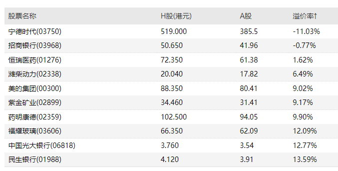 截至12月15日收盘,弘业期货(A股代码001236,港股代码03678)列AH溢价率第三名,溢价率为265.78%。当天,弘业期货港股收于3.390港元,A股收于10.35元。