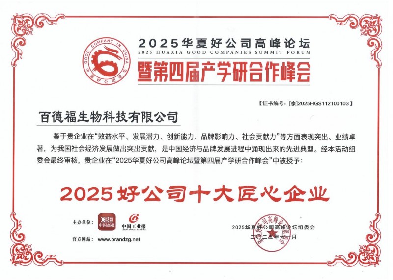 与此同时,备受瞩目的榜单也在会上揭晓,百德福生物科技有限公司凭借在“效益水平、发展潜力、创新能力、品牌影响力、社会贡献力”等方面的突出表现,荣获“2025好公司十大匠心企业”称号。
