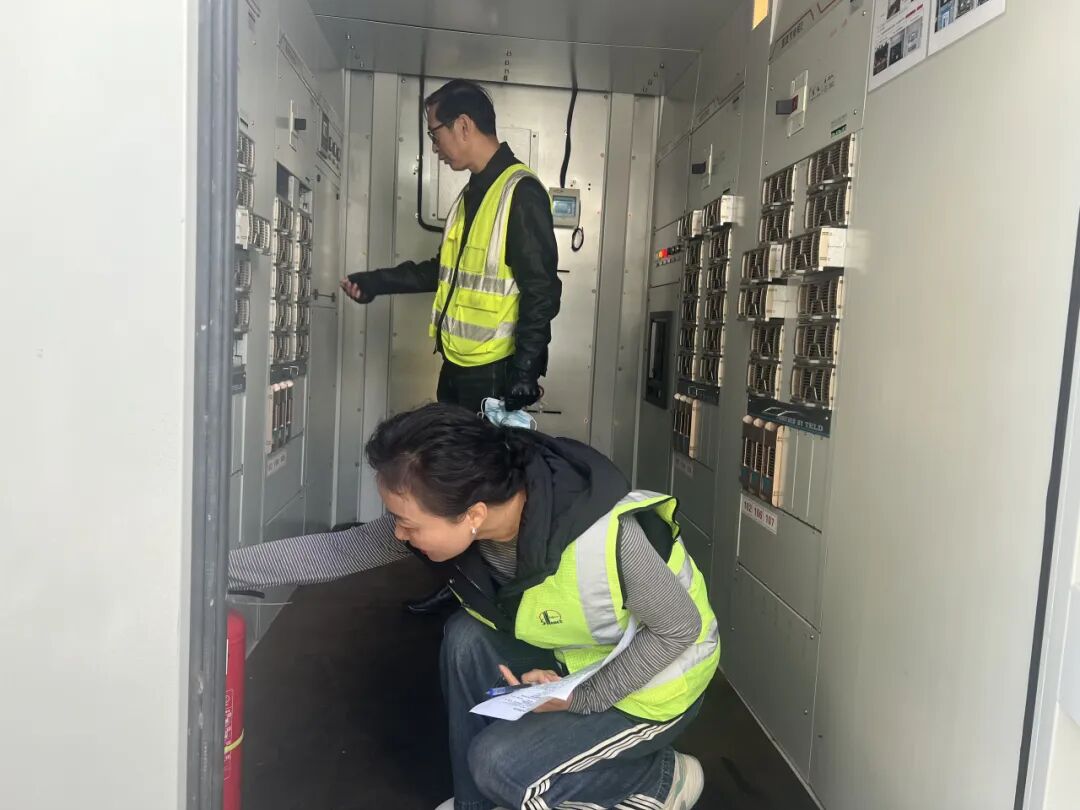 检查小组严格对标标准,深入各充电场站开展拉网式排查。在基础设施与标识方面,细致检查停车位车挡、防撞柱的安装规范度,核对充电导引、安全警告等标识的设置情况及箱变围栏警示标识的完整性。设备运行环节,重点查看充电桩运行状态、有无异常噪音异味,核查充电桩计量检定证书有效性,同时检查箱变、供配电设备的外观完好度与内部线缆绝缘、散热系统运行情况。此外,检查小组还对消防设备配置数量与摆放位置、视频监控覆盖范围及存储时长、应急照明与急停装置等配套设施进行全面核验,确保各环节符合安全标准。