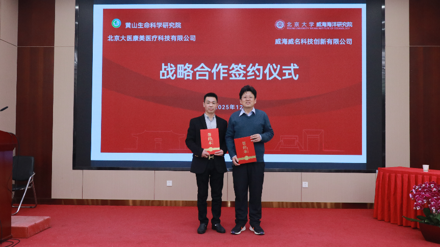 会议期间,北京大学威海海洋研究院与黄山生命科学研究院签署了战略合作。北京大学威海海洋研究院执行院长、北京大学物理学院杨金波教授对威海海洋研究院的整体情况和各版块项目落地进展做了主旨发言,并与黄山生命科学研究院副院长代瑞宁完成签约仪式。