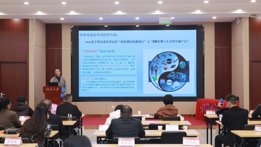 北京大学威海海洋研究院主动健康研究促进中心主任刘顺荃汇报了其团队在医体融合项目方面的工作进展,并作题为“主动健康视角下的筋经调疾原理与物理场康复技术”的报告。