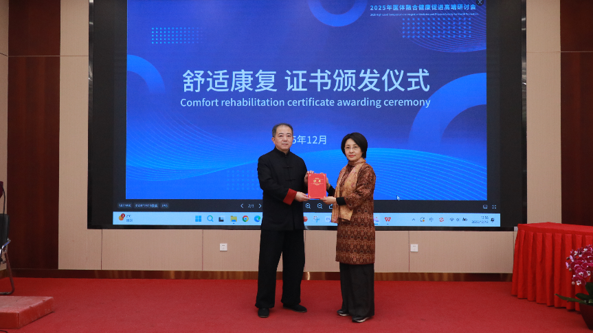 活动现场,黄山生命科学研究院健康产业推广中心秘书长、健康中国行组委会-主动健康研究促进中心主任李文婧为大医康美医疗科技有限公司的食药同源产品、战旗戎(rong)聚光(成都)健康科技有限公司的戎视光平衡护眼中医适宜技术,分别颁发了“舒适康复适宜产品”和“舒适康复适宜技术”认证证书。