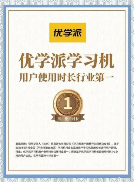 当学习机从“被动工具”变成孩子愿意主动打开的学习搭档,其使用时长便成了产品实力的直观印证。华信人(北京)信息咨询有限公司发布的《学习机用户消费行为洞察白皮书》显示,优学派学习机在用户使用时长维度居行业榜首——其每日使用时长超过1小时的用户占比,在所有主流学习机品牌中位列第一。这份覆盖全国万千家庭的真实调研数据,充分证明优学派学习机在产品实用性和用户美誉度上具备显著优势,用户使用时长行业第一不仅是一个排名,更是一种市场认可度的体现。