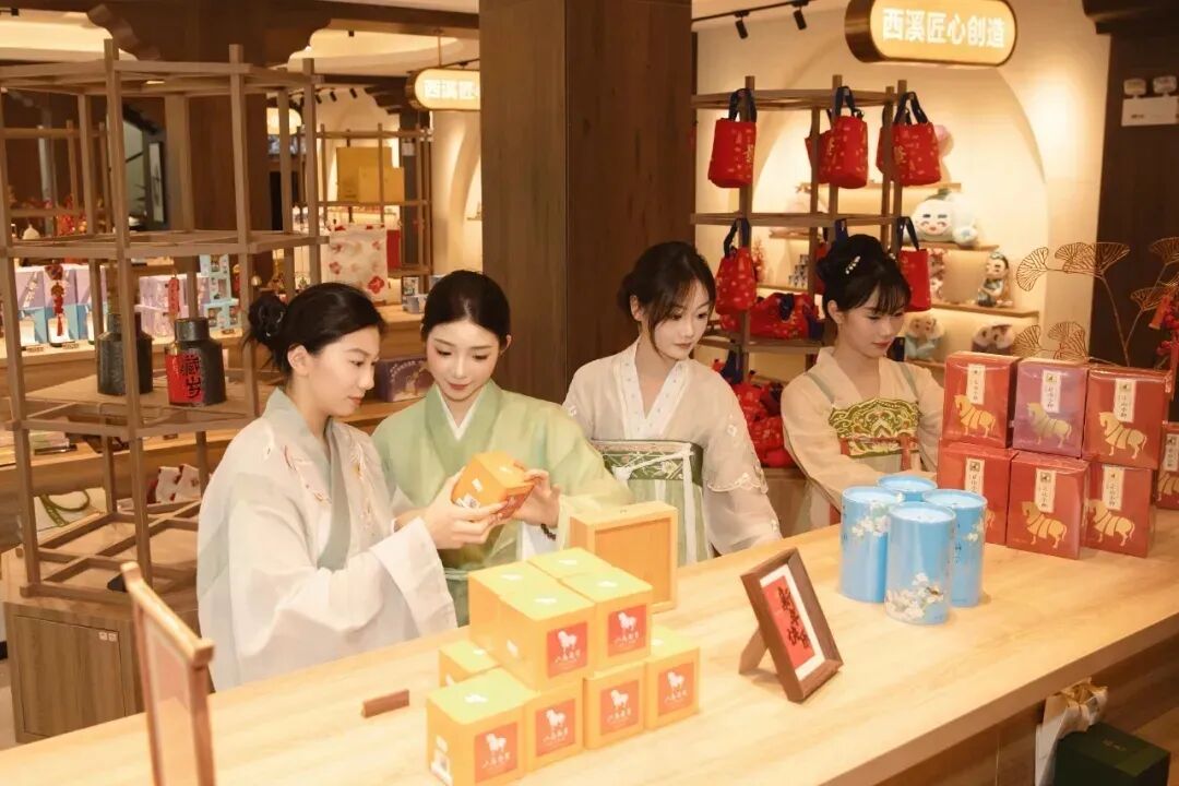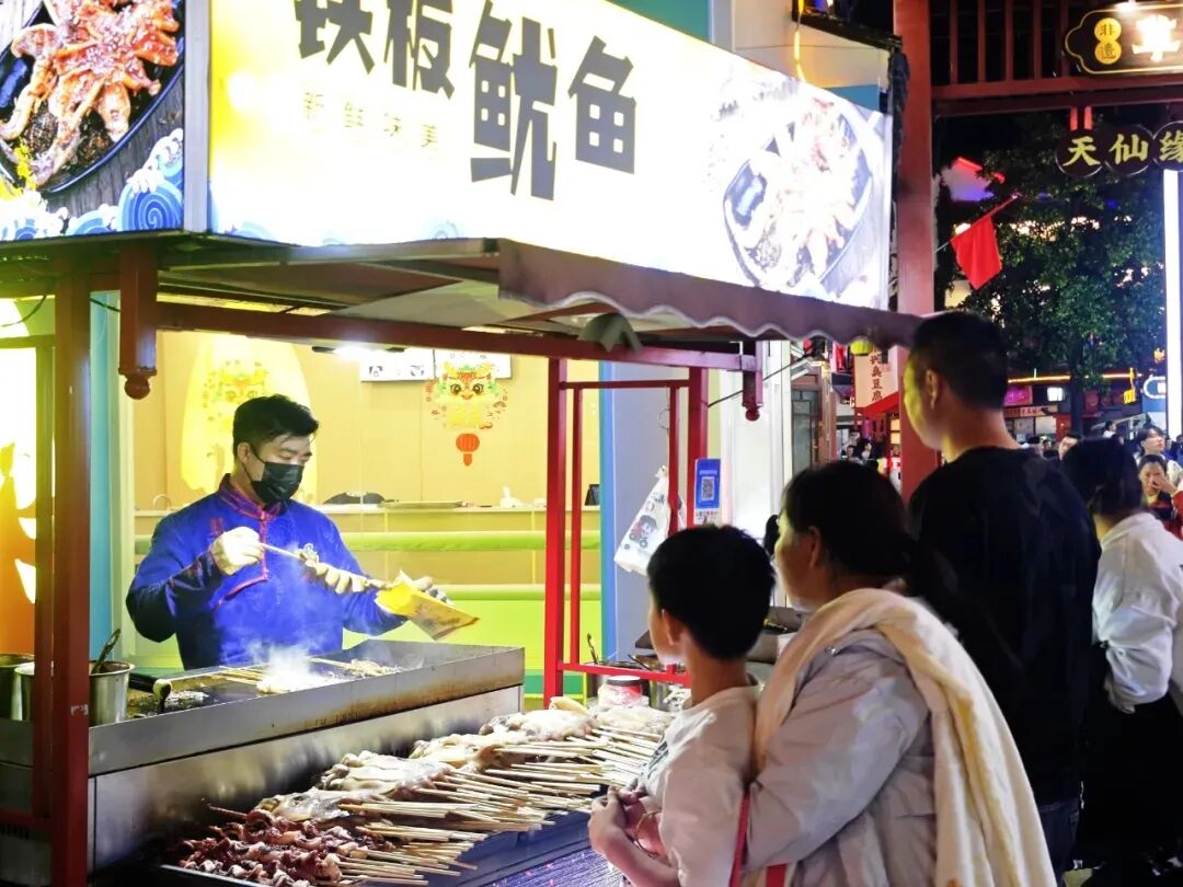在草市街,各类风味小吃引人驻足,鸭血粉丝、臭豆腐、铁板鱿鱼等令人应接不暇。同时,以董永与七仙女传说为灵感设计的“董哥哥仙仙妹”IP文创产品同步亮相,涵盖玩偶、水杯、雨伞、冰箱贴等多样品类,成为游客留念与馈赠之选。