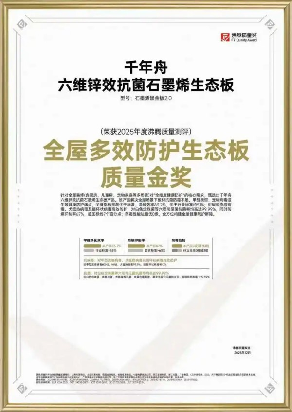 据悉,沸腾质量奖作为家居领域极具公信力的质量认证体系,以严苛标准真实检测为核心,从环保安全、物理性能、功能实效等多维度对产品进行全方位考核,其奖项被誉为家居品质的“黄金通行证”。此次千年舟石墨烯黑金板2.0的脱颖而出,正是源于在健康防护与品质稳定性上的双重突破。