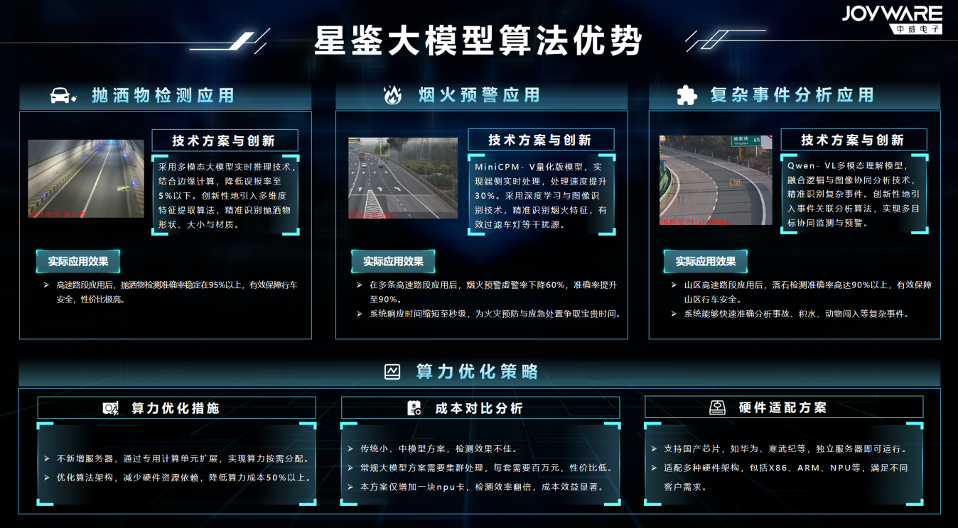 依托“通用大模型+行业场景+训练调优”核心架构,中威电子将星鉴大模型技术优势与各行业业务需求深度融合,打造定制化智能解决方案,目前已在公路、交通、工业、城市等十余领域实现规模化应用,成为行业智能化转型的“助推器”。