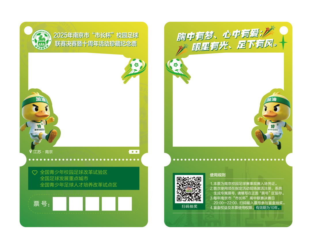 赛前,珍藏纪念票将分发至赛场周边的全国青少年校园足球特色学校。这既是对长期以来坚定支持、深情陪伴的师生及家长致以诚挚感恩,也愿以纪念票为媒,让南京校园足球的独特文化基因持续传递、生生不息。
