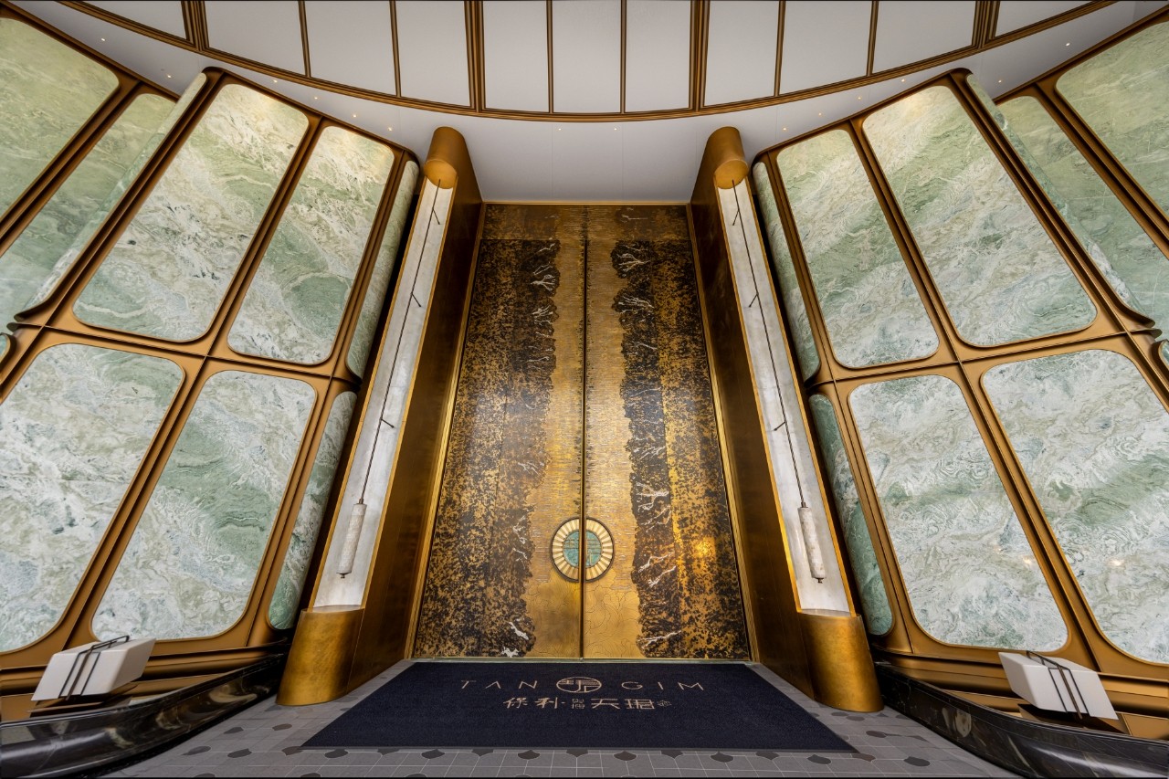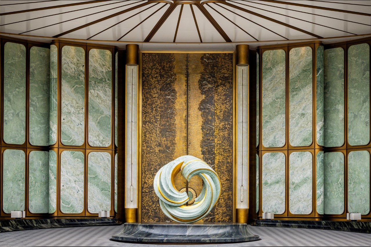 在高端地产领域,朱炳仁铜艺同样以创新定义标准。在杭州保利天珺项目中,一樘高约10米的巍峨铜门矗立于归家序章。它将铜的厚重与玉的温润交织,门心似江南折扇徐徐展开,边沿缀以灵动钱塘水纹。这不仅是物理的门,更是以当代设计语言,重新诠释东方门仪礼序与家族传承的精神符号,树立了豪宅铜门艺术化定制的全新范本。