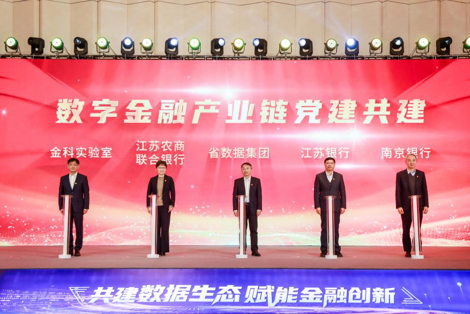 为了发挥共产党员在数字金融产业链建设中的先锋模范作用,实验室还成立了“鑫锋・数金”党员志愿服务队。与此同时,实验室与省数据集团、江苏银行、江苏农商联合银行、南京银行等组成的数字金融产业链党建共建正式启动。