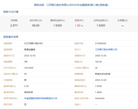 新华日报财经讯 近日,江苏银行在全国银行间债券市场成功发行江苏首单浮息金融债券。本期债券发行规模50亿元,期限3年,不仅是江苏省内首单浮息金融债券,也创下了城商行同类债券发行规模的历史新高。