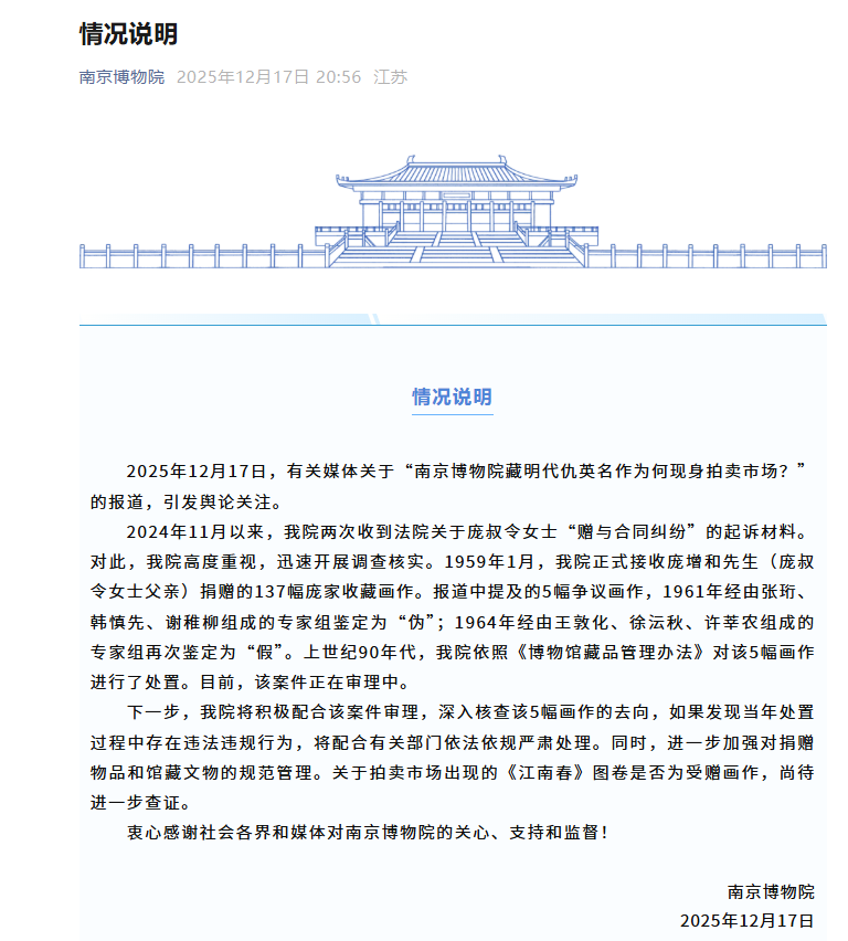 2025年12月17日,有关媒体关于“南京博物院藏明代仇英名作为何现身拍卖市场?”的报道,引发舆论关注。