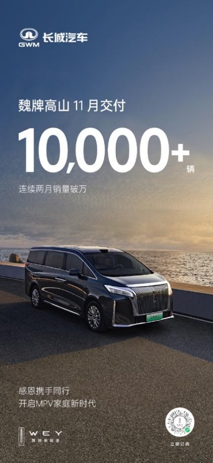 在选购一款家用MPV时,可靠的质量,宽敞的空间,舒适的体验等都是消费者考虑的核心因素。在这一领域中,魏牌高山一直是市场表现非常不错的一款产品,虽然有不少潜在用户会有“魏牌高山质量可靠吗”的疑问,但这款车型也用其销量表现给出了肯定答案。据悉,就在刚刚过去的11月份,魏牌高山再创佳绩,交付量突破10000台,且已是连续两个月销量破万,可见其市场认可度之高。