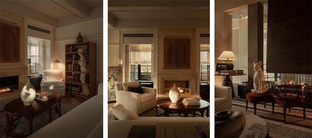 深浅木饰面、黑色立柱与半通透玻璃构成空间骨架,来自世界各地的艺术品在此并置,让空间在展陈与生活之间形成独特的拼贴式体验,形成流动、去中心化的当代美学体验。
