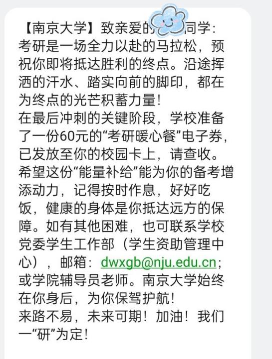 考研护航:提供 “考研暖心餐”餐补、加油短信、祝福海报,各学院定制专属鼓励。