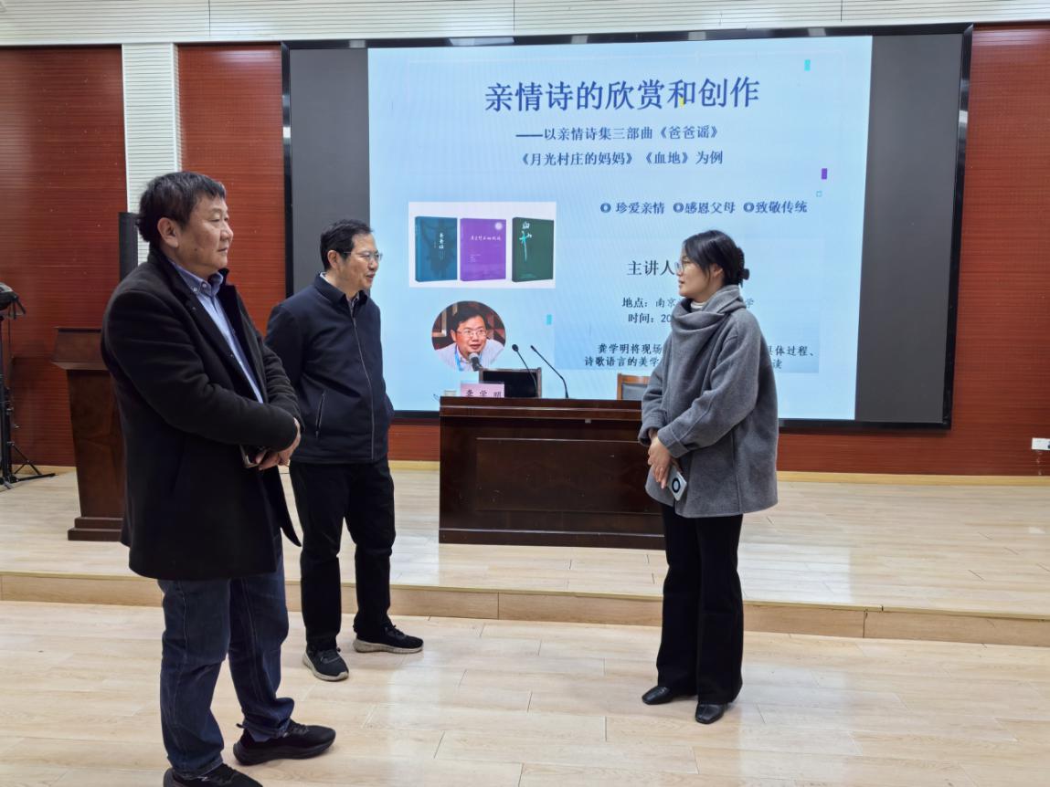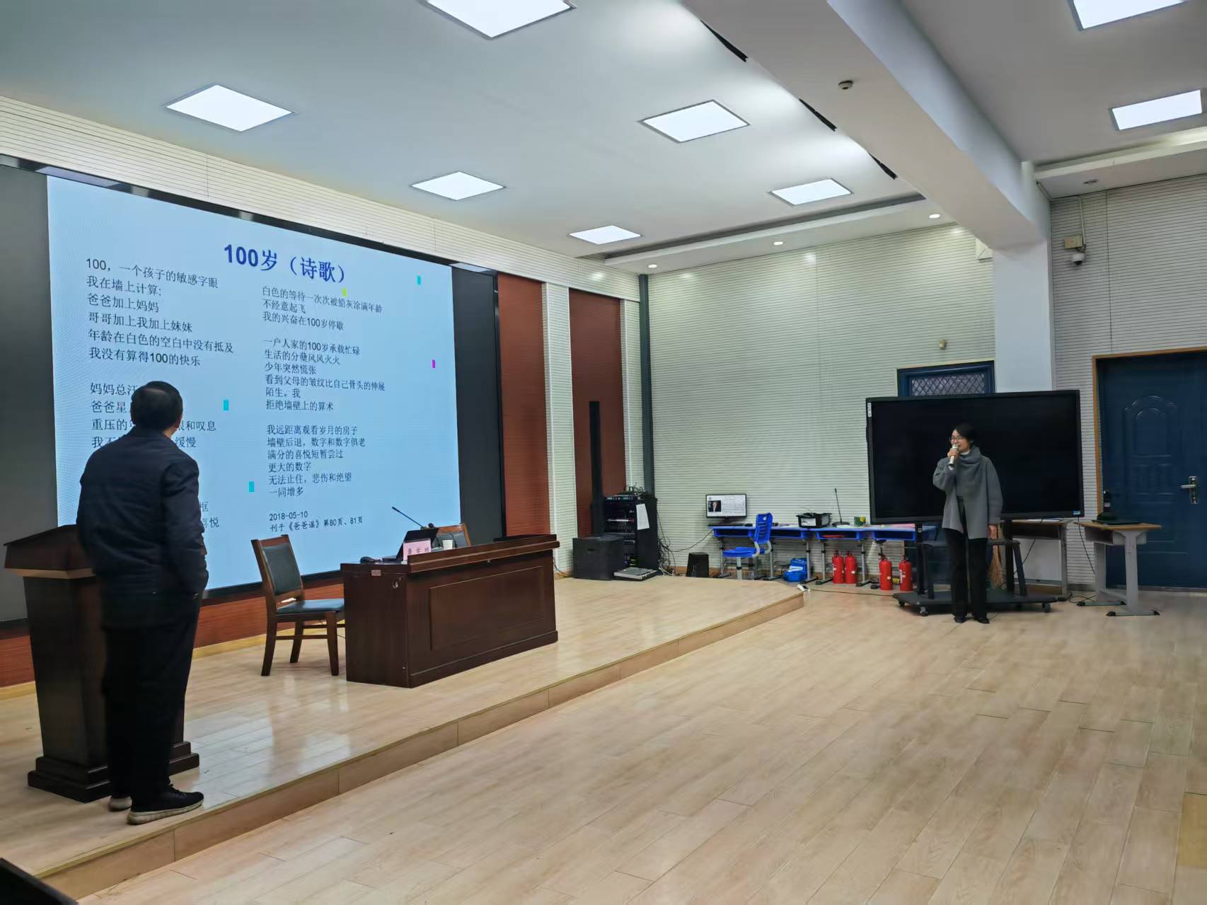 在互动朗读环节,当龚学明谈到诗集里的《100岁》一诗时,石湫中学副校长张芬芬深受触动,主动起身接过话筒,饱含深情地朗读起来。醇厚的嗓音里满是真挚的情感,一字一句叩击着在场师生的心扉,将整场讲座的氛围推向高潮。台下的同学们也纷纷跟着轻声吟诵,报告厅里涌动着浓浓的温情。