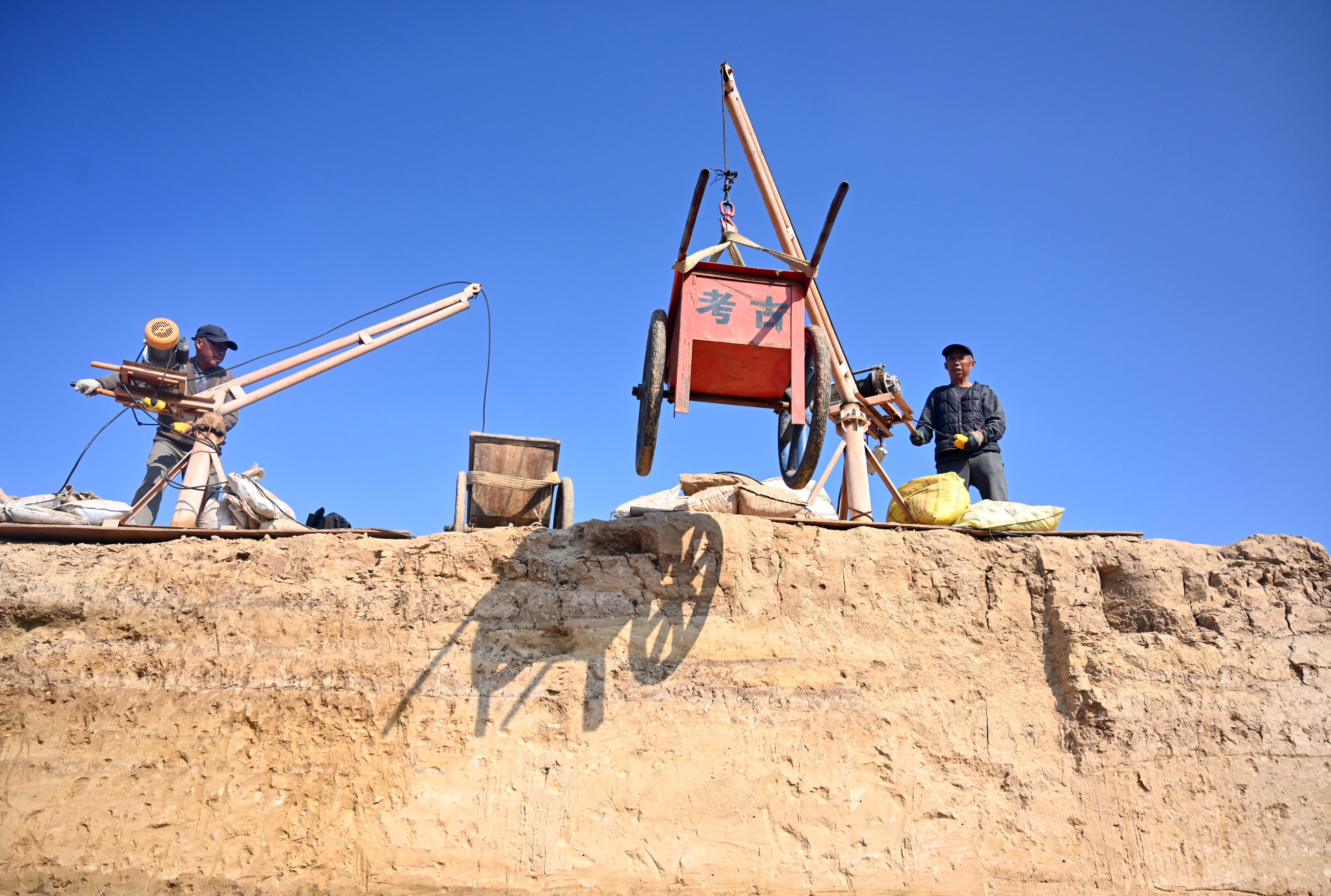▲考古挖掘现场,工人进行坑土清运。