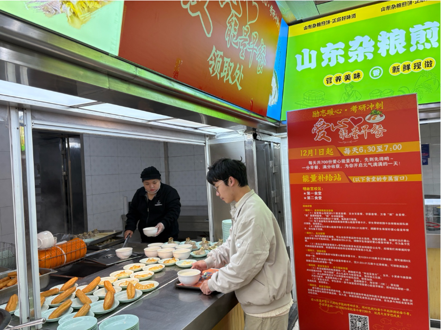 南京农业大学自12月1日起每日限量供应400份一分钱营养早餐,用持续整月的清晨暖意,陪伴每一位早起的研考学子。