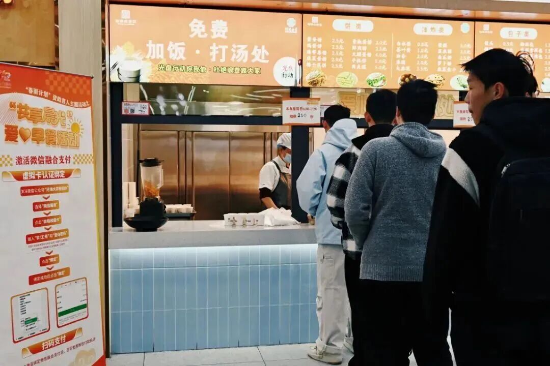 河海大学开展“共享晨光”爱心早餐活动,清晨六点半天还未亮,河海食堂却已升起暖意:一碗热粥、两个包子、一枚鸡蛋,只需0.01元,每天供应2000份,为早起奋斗的研考学子们点亮第一缕温暖。