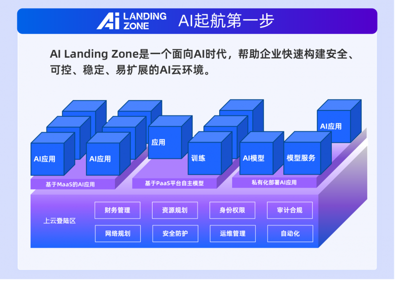 在至关重要的“AI 准备”阶段,阿里云强调,企业必须构建一套通往生产环境的“数字登陆区”——AI Landing Zone(AI LZ)。它既是一个基于云计算最佳实践构建的标准化、自动化、可治理的 AI 基础设施平台,也是一套融合组织协同、流程规范与自动化治理的系统方法,确保企业在 AI 项目启动之初,就能在安全、稳定、合规与成本管控等关键维度建立完善的治理能力。