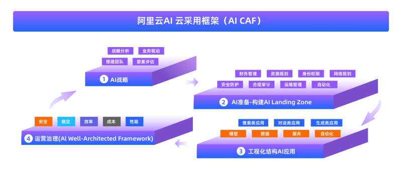 在AI CAF中将复杂的 AI 落地过程清晰拆解为AI 战略、AI 准备、工程化构建AI应用与运营治理四个可执行阶段,并通过端到端的方法论体系指导企业跨越从 AI 概念验证(PoC)到规模化生产的关键鸿沟。