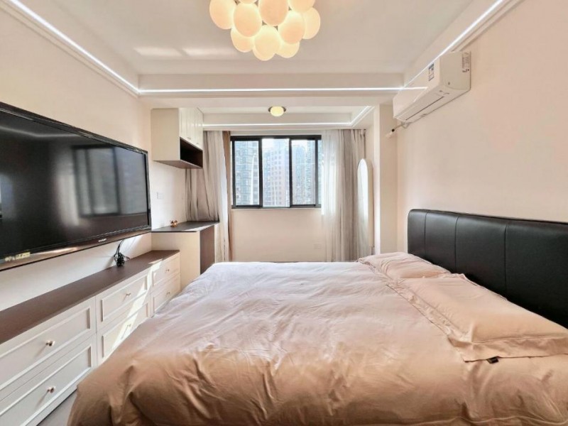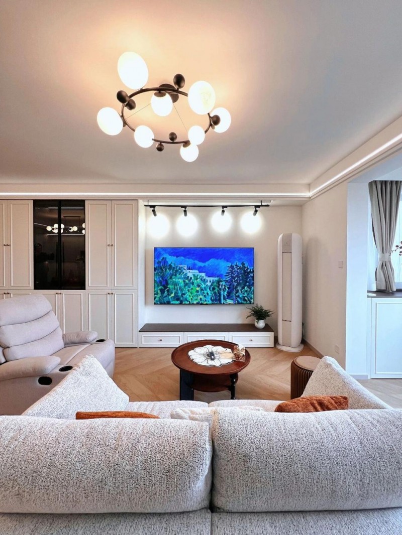 功能与美学的平衡也在细节中体现得淋漓尽致。客厅整面收纳柜不仅藏起生活琐碎,更巧妙嵌入“隐形门”连接主卧,既保持了立面完整性,又实现了公共区域与私密空间的自然过渡。侘寂风沙发搭配十八纸折叠凳,兼顾了日常休憩与临时会客的需求,让空间充满灵活生命力。意式魔豆吊灯与环绕灯带的组合,让光线层次丰富,夜晚归家时,柔和的照明瞬间消解疲惫。