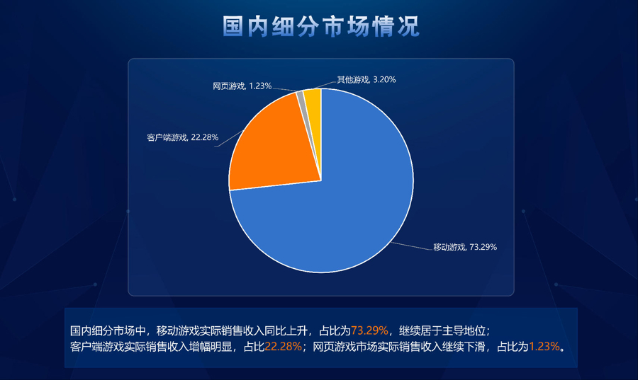 国内细分市场中,移动游戏市场实销收入2570.76亿元,占比73.29%,继续居于主导地位。客户端游戏市场实销收入781.6亿元,同比大幅增长14.97%。国内网页游戏市场实销收入同比下降6.74%,整体规模为43.25亿元,收入下滑已持续10年。在国内收入排名前100的移动游戏产品中,角色扮演类数量居首,占比20%,相比前两年有所下降;策略类(含SLG)数量次之,占比11%,较去年上升一位;卡牌类占比8%,较去年下降一位;射击类占比7%,较去年有所提升。