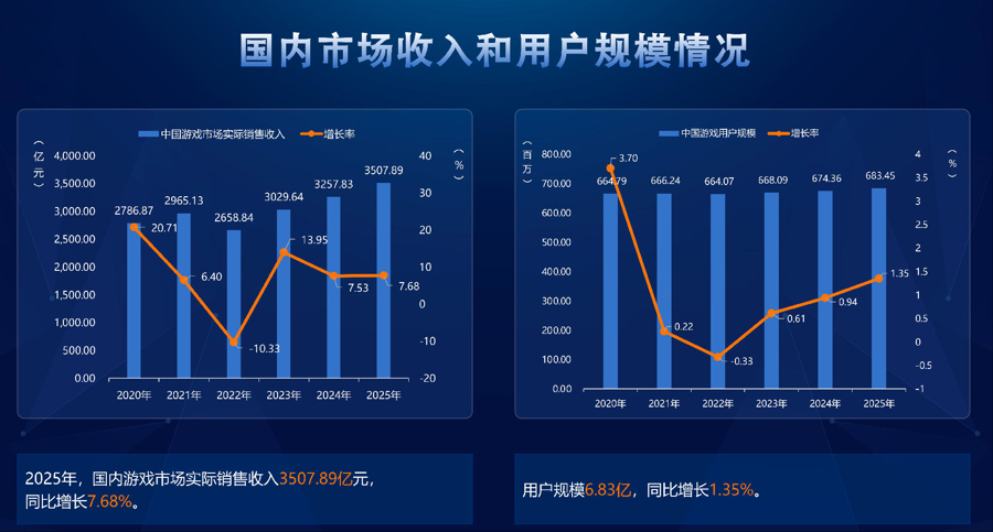 12月19日,由国家新闻出版署主管,上海市新闻出版局支持,中国音像与数字出版协会、上海市徐汇区人民政府主办的2025年度中国游戏产业年会在徐汇区西岸国际会展中心举行。现场发布的《2025年中国游戏产业报告》显示,2025年,国内游戏市场实际销售收入3507.89亿元,同比增长7.68%;用户规模6.83亿,同比增长1.35%。同为历史新高点。