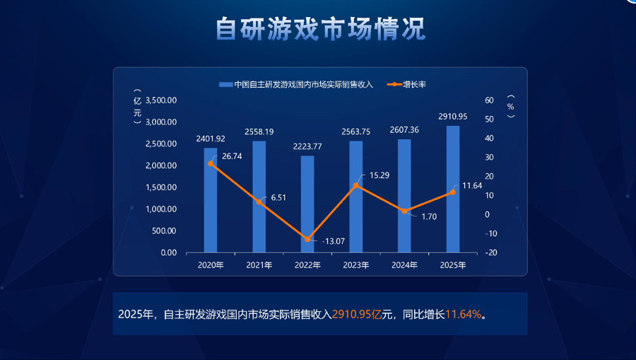 具体来看,2025年,自主研发游戏国内市场实际销售收入2910.95亿元,同比增长11.64%,除得益于头部长青产品稳定支撑外,多款自研新品也带来明显增量。自研游戏海外市场实际销售收入204.55亿美元,同比增长10.23%,规模已连续六年超千亿元人民币。