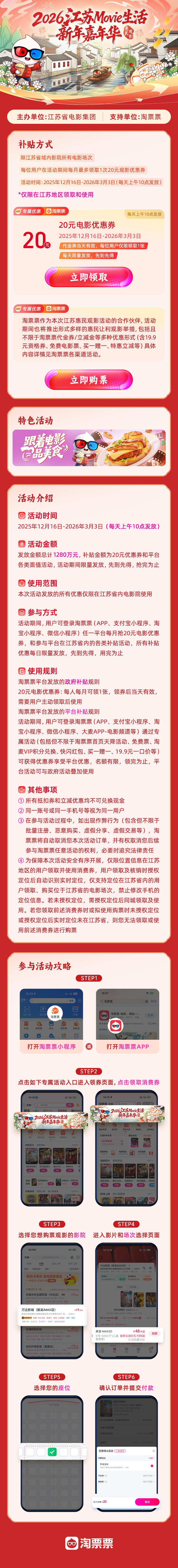 在此期间,观众凡是购买江苏地区影院的电影票,都有机会获得“立减20元”观影消费券。活动期间,每日上午10时起,市民可通过淘票票App或支付宝、淘票票小程序领取观影消费券。此外,活动还将同步投放不少于100万份随机金额观影红包,为观众带来更多惊喜优惠。
