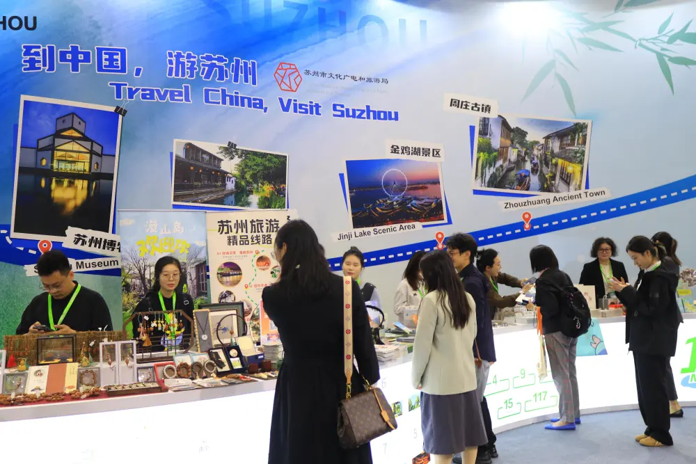 展会期间,在江苏展区,苏州文旅、苏州阳澄湖泰康万豪酒店、向红绣府苏绣、苏州独墅湖世尊酒店及周庄古镇轮番进行推介。为更好地展示苏州文旅形象,苏州市文广旅局还准备了苏式糕点、苏扇、Visitsuzhou文旅大礼包等互动物料,让参展观众感受到苏州这座“双面绣”城市的热情。