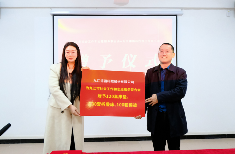 作为本土企业,九江德福科技始终将履行社会责任、投身公益事业作为重要使命。此次捐赠聚焦民生需求,精心筹备了床垫、折叠床、被褥等实用性强的物资,旨在为九江市困难家庭、独居老人改善居住条件,同时为当地减灾备灾工作提供物资支撑,并配合“薪火共益项目”开展社区关怀与志愿服务活动,构建“物资 + 服务”的立体帮扶体系,让爱心资源精准惠及有需要的群体。