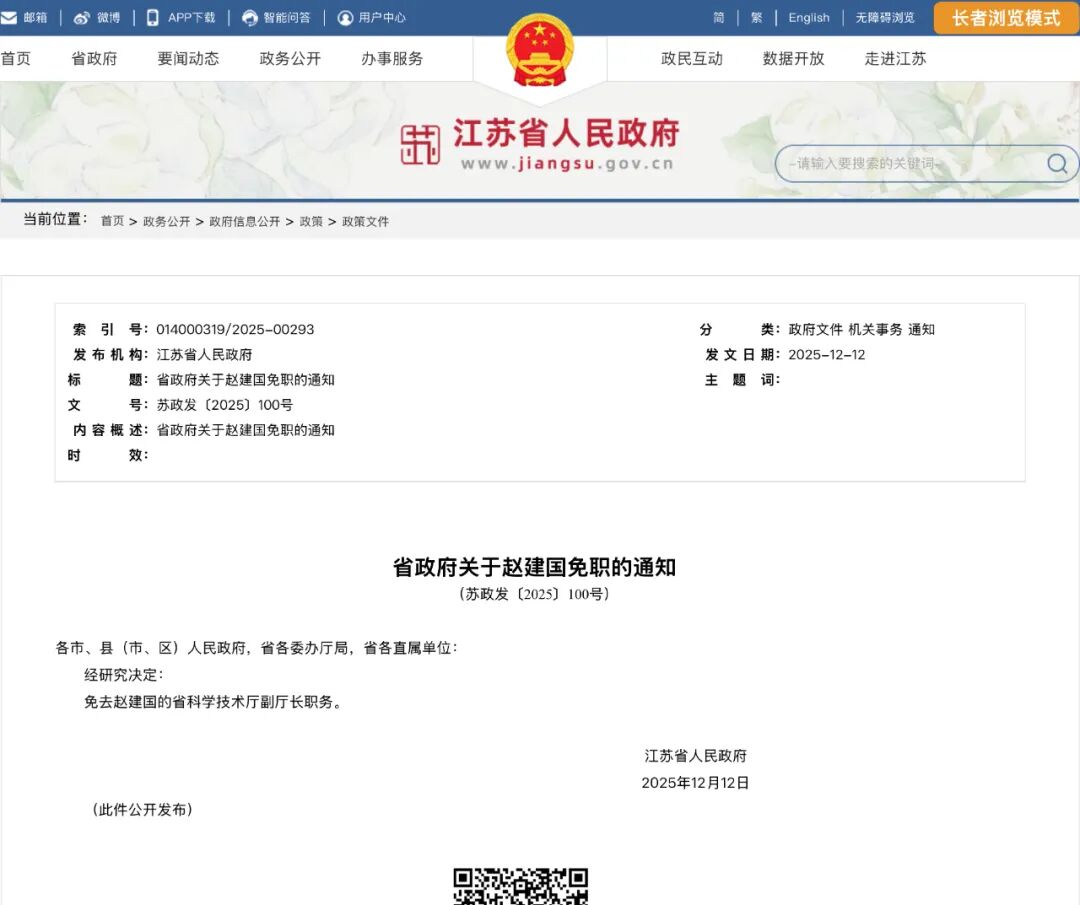赵建国曾任江苏省科学技术厅发展规划处处长兼资源配置处处长等职,2020年任江苏省科学技术厅副厅长,至此番履新。