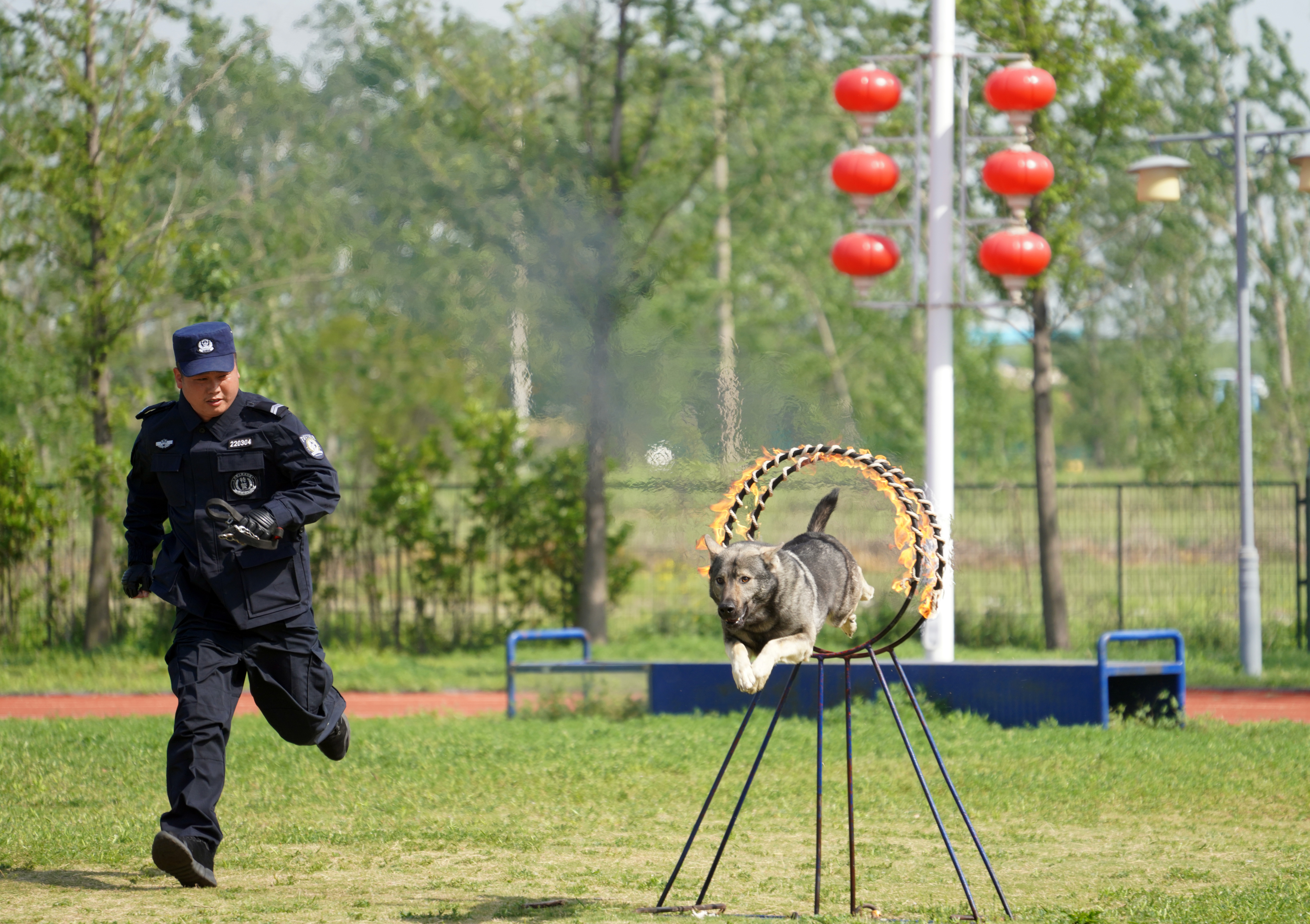 昆明犬,根据毛色的不同,又被分为狼青、草黄和黑背。昆明犬体形近似方形,运动能力和持久力卓越,感官敏锐,注意力高度集中。而它最大的优势就是全能基础上的强大嗅觉。在训练基地中,15头昆明犬耳朵直立,眼神锐利,四肢肌肉线条紧实,奔跑起来迅捷如风。面对一米多高的火圈,它们毫不犹豫,一个助跑,腾空跃过,稳稳落地,动作一气呵成。在嗅探追踪科目里,它们鼻子紧贴地面,细致探索,即使是极其微弱的气味痕迹,也能被它们精准捕捉。对抗演练环节,面对模拟目标,它们更是果敢出击,扑咬动作干脆利落,展现出“无言战友”的专业与勇猛。