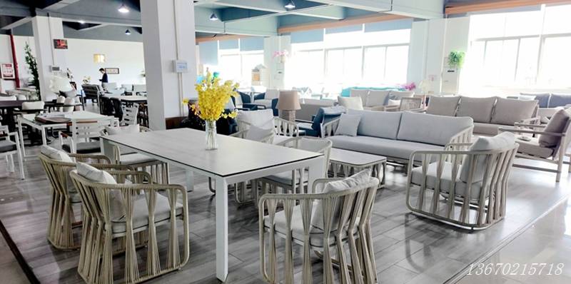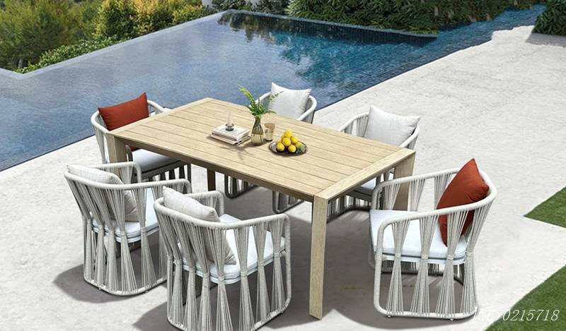 针对户外家具 “易损耗、难打理” 的痛点,嘉鹏户外家具的Alexa 系列打造 “铝合金框架 - 户外绳编 - 防水面料” 三位一体耐候结构。全系采用壁厚≥1.2mm 的6063铝合金框架,经专业喷涂防锈抗腐蚀,适配沿海盐雾、高温暴晒等复杂环境;手工编织的户外专用绳材搭配防水防污面料,桌面板材可直接摆放高温餐食,沙发坐垫雨后擦拭 3 分钟即干,真正实现 “户外使用免维护”,让用户省心享受自然时光。